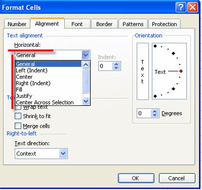 In tabul Alignment se alege din lista corespunzatoare optiunii Horizontal se pot alege una din optiunile de aliniere a textul dintr-o celula. 242d39c