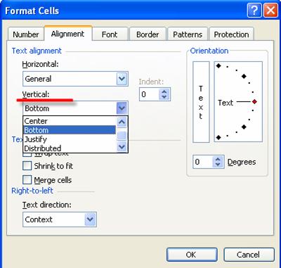 Alinierea implicita pentru text si numere este in partea inferioara, insemnand amplasarea caracterelor chiar deasupra marginii inferioare a celulei. De asemenea, aveti posibilitatea sa modificati alinierea verticala a celulelor, in partea inferioara, in partea superioara sau la centru. Alinierea la centru arata adesea bine cand se doreste marirea inaltimii unui rand pentru a scoate in evidenta etichetele sau valorile stocate pe rand, dar mentine intrarile centrate intre partea superioara si partea inferioara ale randului.