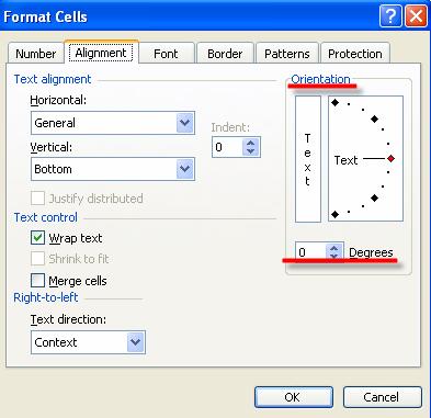 Pentru ca textul introdus sa fie afisat pe verticala, in loc de orizontala, se va apela tot la fereastra Format Cells, in care, in dreptul optiunii Orientation se poate alege orientarea textului la orice unghi dorit de catre utilizator.