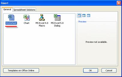 Din caseta de dialog Insert, se va alege optiunea Worksheet si apoi se va accesa butonul OK la fel ca in imaginea de mai jos