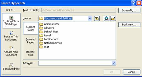 In caseta de dialog Insert Hyperlink (Inserare hiperlegatura) se va introduce un nume de folder si un nume de registru de calcul catre care se va crea hiperlegatura