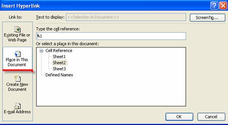 In caseta de dialog Insert Hyperlink se selecteaza butonul Place in This Document (Plasare in acest document).