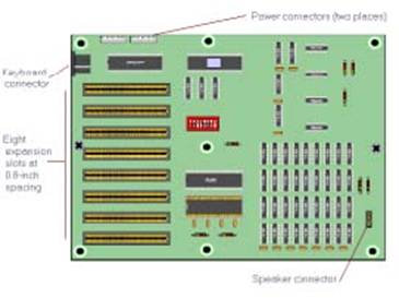 b) placa de baza pentru XT, de 8.5 x 12 inci, sloturile de extensie la 0.8 inci, montate in linie pentru a permite si magistrale de mare viteza PCI: