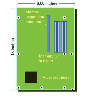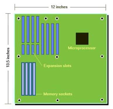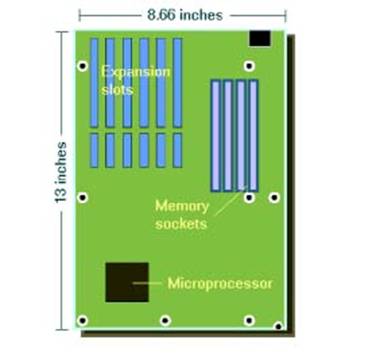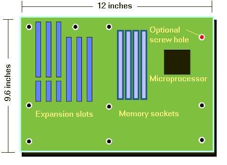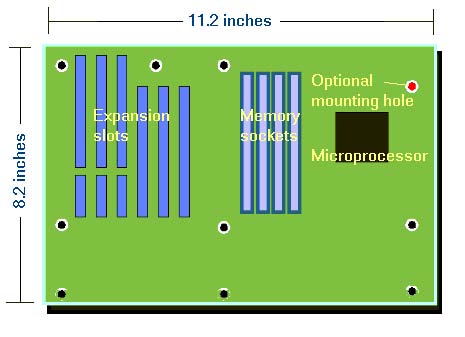 f) placa ATX, cel mai nou standard, pastreaza dimensiunile placii mini-AT, versiunea 1.1. introdusa de Intel in 1996. Dimensiunea 12 x 9.6 inci este impusa pentru a putea taia 2 placi dintr-un panou brut imprimat de 18 x 24 inci. Au un altfel de conector de alimentare;