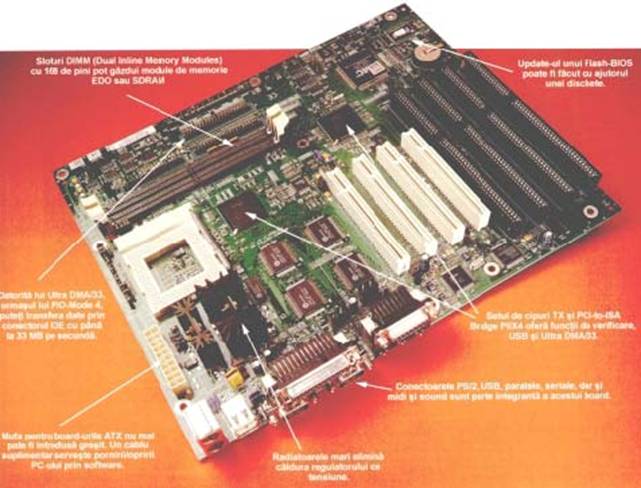 d) placa de baza LPX, pentru PC-uri mai putin £lte, are 8.66 x 13 inci, latura din spate a sasiuluiparalela cu latura mica a placii si contine conectorii I/O. Are un conector de extensie principal in care se afla o placa fiica cu unul sau mai multi conectori standard;