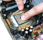 Inserati procesorul. Odata pozitionat conform punctului 3, procesorul ar trebui sa se aseze fara probleme în socket. Daca acest lucru nu se întâmpla, motivul poate fi constituit fie de deschiderea incompleta a socketului, fie de un pin îndoit si neobservat la pasul 1, fie pinul 1 nu se afla în pozitia corecta. În acest caz repetati verificarile de mai sus.