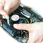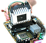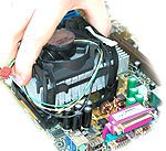 Placa de baza fiind asezata pe o suprafata plana, plasati radiatorul deasupra procesorului si apasati usor. Majoritatea coolerelor noi folosesc un clip metalic pentru a se fixa de socket. Operatiunea de prindere a clipurilor necesita foarte mare atentie. Exista riscul de a apasa prea tare si de a sparge procesorul. De asemenea, daca folositi o surubelnita pentru a ghida urechea clipului aveti grija sa nu o scapati în placa de baza, spargerea acesteia însemnând în majoritatea cazurilor si înlocuirea ei.