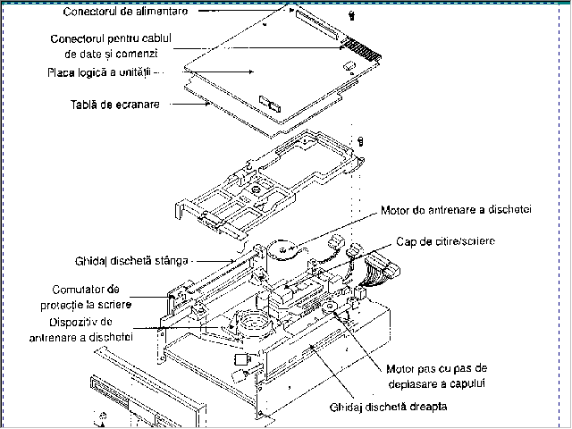 Unitatile de discheta:pot avea defectiuni mecanice sau capetele de citire scriere a le acestora au praf caz in care se curata cu o dicheta speciala(disk cleaner) si cu solutie speciala.Structura sa interna este: