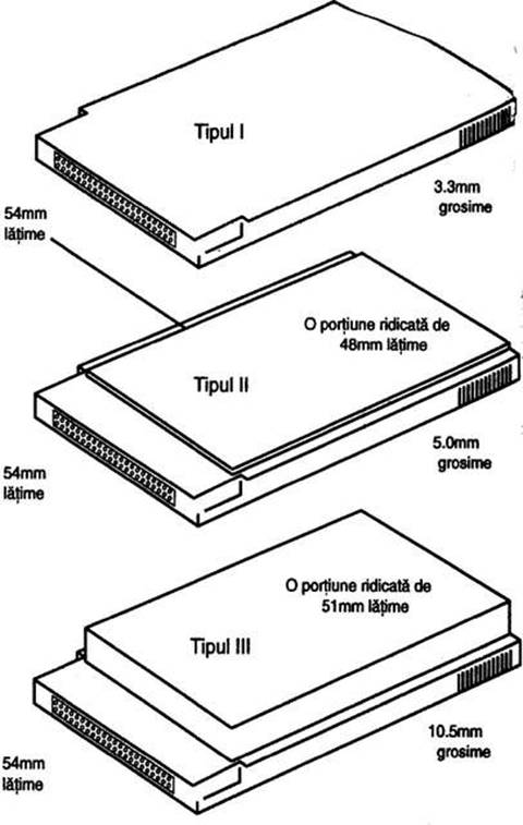 posibilitate de dezvoltare, au 68 pini si 2.1 x 3.4 inci. Exista 3 variante constructive: PC Card, Card Bus si Miniature Card. PcCard este pe 16 biti, cele mai cunoscute tipuri fiind: -tip I de 3,3 mm grosime, doar pentru extensii de memorie -tip II de 5 mm contin orice dispozitiv