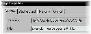 Selectati optiunea "Page Proprieties" din meniul File. Ca urmare a acestei comenzi, ca efect vizual, va apare o fereastra cu patru liste: "General", "Background", "Margins" si "Custom". In sectiunea "General" aveti posibilitatea de a configura titlul paginii dumneavoastra, titlu care va fi afisat in fereastra browserului. Apoi aveti posibilitatea de a specifica felul in care utilizatorul este directionat in pagina, puteti insera un fundal sonor si puteti configura setul de caractere folosit la codarea ei in html si la decodarea ei in browser. Daca aveti de gand sa inserati un fundal sonor, noi va recomandam un fisier de marimi mici (preferabil *.mid sau *.asf). In general fundalul sonor este inutil si va puteti lipsi de el. Despre setul de caractere cu care ar trebui salvata pagina, va recomandam setul Central European ISO 8859-2 mai ales daca aveti si unele caractere regionale.