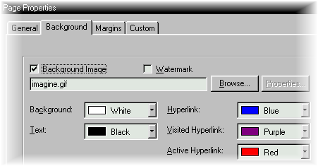 In sectiunea "Background" (figura de mai sus) se pot configura fundalul si culorile care apar in pagina dumneavoastra. Puteti sa puneti in fundal o imagine (ex: imagine.gif), cu conditia ca imaginea sa fie de dimensiuni foarte mici. Daca renuntati la imagine in fundal, puteti alege o culoare simpla. Dupa cum se vede mai sus, se poate configura culoarea fundalului ("Background"), culoarea textului normal ("Text"), si culoarea legaturilor spre alte eventuale pagini, in diferite momente: ("Hyperlink"= pagina care nu a fost accesata"; "Visited Hyperlink"= pagina care a mai fost accesata din pagina dumneavoastra; "Active Hyperlink"= pagina care este incarcata in momentul imediat accesarii ei).
