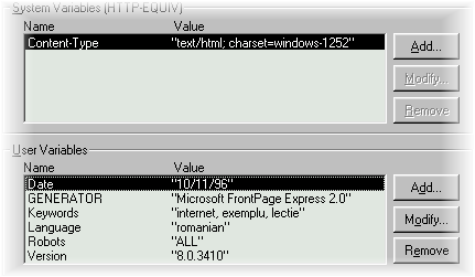 In sectiunea "Custom" pe care o vedeti reprezentata in figura de mai sus, se pot configura variabilele din pagina, variabile care necesitau mai demult interventia in codul sursa. De aici nu trebuie sa lipseasca variabilele "keywords" si "robots", deoarece multe motoare de cautare se folosesc de ele. 616b18g Ca un pont, va sfatuim sa folositi in variabila "keywords" cat mai multe cuvinte cheie, dar in legatura cu continutul paginii, pentru a avea mai multe sanse de a fi gasiti pe web.