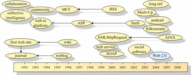 Multe dintre tehnologiile si aplicatiile care astazi le regasim grupate in cadrul termenului umbrela de Web 2.0 au fost generate, folosite si adaptate cu mult inaintea definirii de catre O’Reilly a conceptului de Web 2.0. Figura 2, publicata de catre Jürgen Schiller García in 2006, prezinta la scala temporala momentul aparitiei unora dintre termenii folositi in corelatie cu Web 2.0