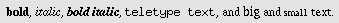 <P><b>bold</b>, <i>italic</i>, <b><i>bold italic</i></b>, <tt>teletype text</tt>, and