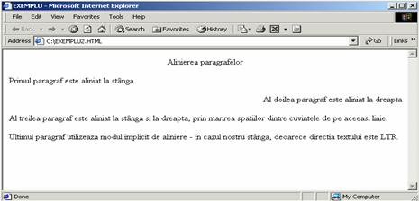 <P> Ultimul paragraf utilizeaza modul implicit de aliniere - în cazul nostru stânga, deoarece directia textului este LTR. </P>