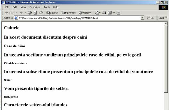 De exemplu, daca dorim sa elaboram un document despre câini, îl vom structura pe mai multe capitole (primul capitol poate fi denumit ,,Rase de câini", al doilea ,,0rigine" etc.). în capitolul ,,Rase de câini" vom prezenta toate rasele canine, grupate pe categorii (de exemplu, într-o prima sectiune prezentam rasele de câini de vânatoare, într-o a doua categoric, rasele de câini de paza si protectie etc.).