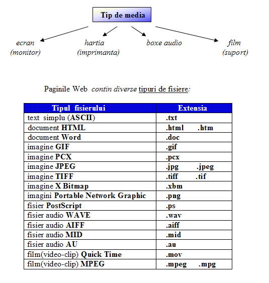 Tipurile fundamentale de media sunt: ecranul, hartia. Tipurile de media sunt definite de specificatiile CSS (Cascading Style Sheets). Limbajul HTML care este utilizat la crearea paginilor Web se bazeaza pe limbajul de descriere a redactarii programelor si documentelor si care este denumit SGML (Standard Generalized Markup Language). S-au definit si alte limbaje de tip script mai simple si eficiene (de exemplu JavaScript). Explorarea retelei WWW Accesarea paginilor Web cu ajutorul unui browser se realizeaza prin intermediul protocolului http (HyperText Transfer Protocol) care este implementat pe diverse servere, numite servere http. Programul de navigare/explorare trimite mesaj catre serverul respectiv, prin care solicita ca anumite documente sau servicii sa fie puse la dispozitia utilizatorului care a cerut aceste documente sau servicii. La randul sau, serverul accesat, raspunde cererilor prin transmiterea inapoi -catre statia de lucru a utilizatorului- a documentului sau serviciului utilizand protocolul http, iar programul de navigare/explorare il receptioneaza, il interpreteaza, in scopul solicitarii cerute. Calea de comunicatie dintre browser (program de navigare/explorare) si un server din sistemul Internet care gazduieste pagini Web se numeste interfata CGI (Common Gatway Interface). |