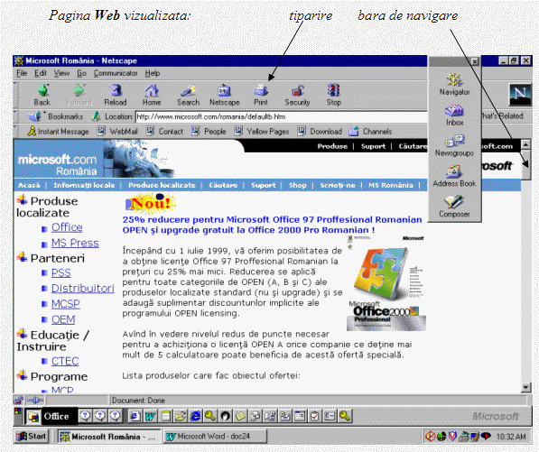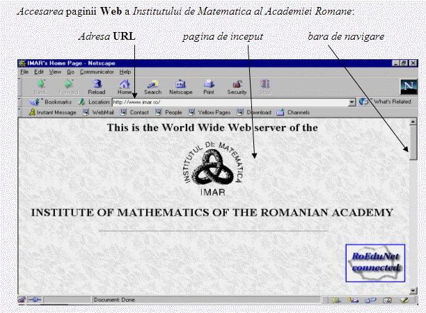 Prin accesarea unei pagini Web, programul browser utilizat acceseaza(deschide) de fapt un document HTML. Acesta contine diverse formatari de texte sau imagini, secvente video si audio, precum si hiperlegaturi catre alte documente HTML. Definitie. O adresa URL (Uniform Resource Locators), numita locatia uniforma de resurse, este folosita de reteaua WWW pentru a specifica(localiza) fisierele ce contin paginile Web sau diverse informatii stocate pe un anumit server din sistemul Internet in vederea accesarii lor de catre utilizatorii-clienti. O adresa URL include tipul de resursa accesat ( de exemplu WWW, Gopher, WAIS, news, telnet, etc.), adresa serverului si calea(path) fisierului accesat. Sintaxa pentru a descrie o adresa(locatie) URL: <scheme >://host.domain/path/file , unde <scheme> poate reprezenta unul din elementele: file - pentru un fisier local (din sistemul utilizatorului); ftp - pentru un fisier de pe un server FTP anonim; http - pentru un fisier de pe un server WWW; gopher - pentru un fisier de pe un server Gopher; wais - pentru un fisier de pe un server WAIS; news - pentru un grup (group) de stiri UseNet; telnet - pentru o conexiune la un serviciu bazat pe Tenet. Accesarea paginii Web a Institutului de Matematica al Academiei Romane: |