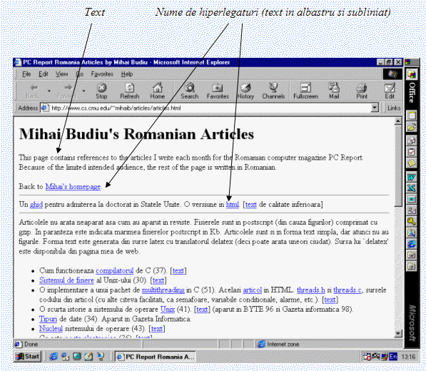 Definitie. Un frame (cadru) este o fereastra (zona dreptunghiulara) in cadrul unei fereste afisata de un browser, zona in care este afisata o pagina Web, in timp ce alte pagini Web sunt afisate in alte zone din fereastra browser-ului. Frame-urile au fost introduse in scopul vizualizarii in acelasi timp a mai multor pagini Web. Orice utilizator isi poate elabora propriile lui pagini Web pentru diverse scopuri (profesionale, sociale, culturale, generale, etc.). Exemplu. Domnul Mihai Budiu, a scris unele pagini Web pentru reteaua WWW in scopul unor discutii privind diverse articole de informatica. |