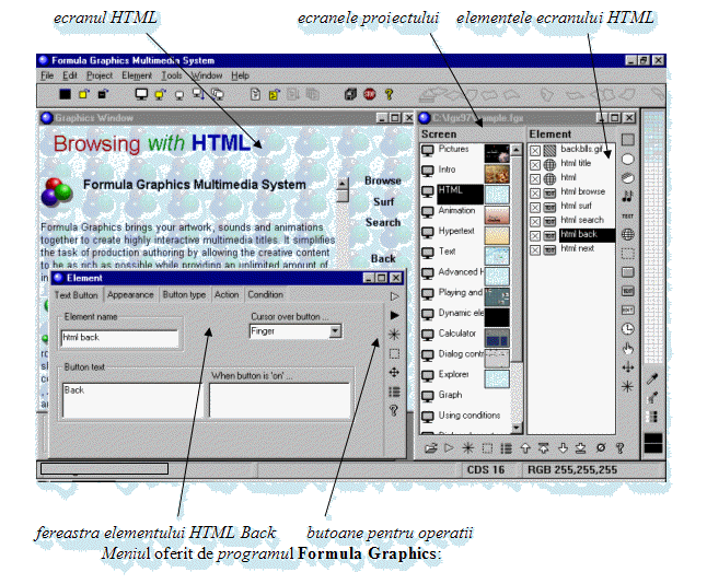Cu ajutorul programului Formula Graphics se elaboreaza urmatoarele produse: Project - constituit din ecrane (screen), fiecare ecran din elemente; un element poate fi bachground, rectangle, picture, animation, animation si sound, video; Script - cod in Script, Hypertext, HTML, Text. La definirea unui ecran trebuie sa se percizeze parametri de identificare, un parametru fiind numele ecranului. Fiecare ecran se elaboreaza prin definirea de diverse elemente. Asupra fiecarui element se pot realiza operatii corespunzatoare tipului de element Exemplu. Proiectul sample.fgx este constituit din mai multe ecrane, denumite prin Pictures, Intro, HTML, Animation, Hypertext, etc. In imaginea de mai jos este prezentat ecranul HTML cu elementele din care este constituit. Pentru demonstratie a fost selectat elementul HTML Back. S-a afisat fereastra corespunzatoare acestui element in care sunt prezentate meniuri si butoane pentru identificarea lui si realizarea de operatii asupra lui. |
