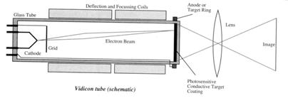 b)Camerele cu vidicon -camere de tip vechi cu tub de vacuum sunt camere mai ieftine si servesc ca prototip de comparatie cu camerele solide, iar principiul de functionare este cel al fotoconductibilitatii, o imagine ce patrunde pe suprafata tubului, altereaza conductibilitatea unui învelis al acestuia. Un fascicul de electroni bombardeaza fata posterioara a acestui învelis fotosensibil si prin neutralizarea sarcinilor electrice creeaza o diferenta de potential care produce pe un electrod colector un curent. Prin esantionarea si cuantificarea acestui semnal se obtine imaginea digitala. (Figura 6.5.)