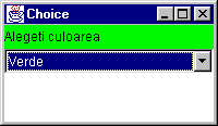 Un obiect de tip Choice defineste o lista de optiuni din care utilizatorul poate selecta una singura. 434j92e La un moment dat, din întreaga lista doar o singura optiune este vizibila, cea selectata în momentul curent. O componenta Choice este însotita de un buton etichetat cu o sageata verticala la apasarea caruia este afisata întreaga sa lista, pentru ca utilizatorul sa poata selecta o anumita optiune.