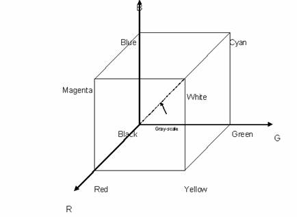 Modelul RGB se poate reprezenta printr-un cub în 3D, R, G si B fiind colturile fiecarei axe (Figura 5.11.).