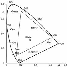 -triunghiul înscris reprezinta culorile care sunt tipice tuburilor video de afisare care folosesc mixajul RGB.