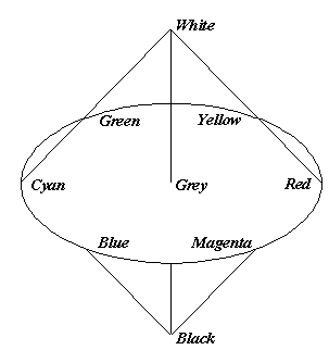 În aceasta reprezentare biconica a spatiului HSI, Intensitatea I (Grey) variaza în lungul axei centrale. Distanta dintre axe ne da S (Saturatia) în timp ce directia specifica ne da H (nuanta de culoare).