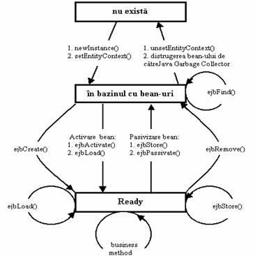 Orice entity bean trebuie sa implementeze metodele din interfata javax.ejb.EntityBean. Tabelul 2.2. prezinta toate metodele care apar īn aceasta interfata, rolul lor, precum si utilizarea lor obisnuita. Pentru o īntelegere cāt mai buna se recomanda urmarirea ciclului de viata al unui entity bean din Figura 2.24. Metodele sunt prezentate īntr-o posibila ordine a apelarii lor de catre container.