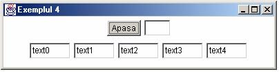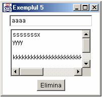 Exemplul 5. Vom afisa un câmp de text, o arie de text si un buton. La apasarea tastei <Enter> în câmpul de text, continutul sau este adaugat ariei de text la sfârsitul acesteia. La apasarea butonului, zona selectata din aria de text este copiata în câmpul de text si la iesirea standard, dupa care este eliminata din aria de text.