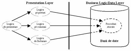 În mod traditional, aplicatiile sunt structurate pe doua tiers: Presentation Layer si Business Logic/Data Layer. Problema cu aceasta abordare este ca logica de bussiness este continuta în procedurile stocate din baza de date. Din pacate, fiecare baza de date are propriul limbaj în care se scriu procedurile stocate, deci este foarte greu portabil. În cele mai multe cazuri, aplicatiile create folosind doar doua straturi (tiers) sunt nescalabile si greu portabile. Arhitectura unei asemenea aplicatii poate fi observata în Figura 2.1.