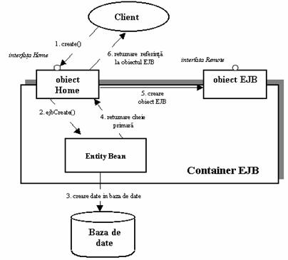 Metoda ejbCreate() initializeaza câmpurile gestionate de container cu valoarea parametrilor de intrare. Metoda returneaza null, deoarece containerul ignora valoarea de return atunci când se utilizeaza container managed persistance. Dupa executia metodei ejbCreate(), containerul insereaza datele în baza de date.