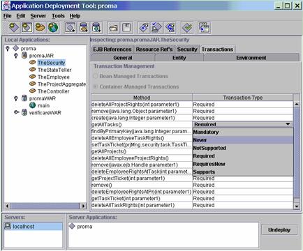 Containerul EJB va sti cum sa abordeze tranzactiile din atributele continute în deployment descriptor. Se pot specifica atribute pentru deployment care sa fie valabile pentru un întreg bean si se pot specifica atribute pentru fiecare metoda a bean - ului. Daca se specifica atribute pentru o metoda, atunci acel atribut este prioritar fata de atributul specificat pentru întregul bean. Cu alte cuvinte, atributul specificat pentru întregul bean se va aplica numai metodelor care nu au un atribut al lor. Modul de specificare a atributelor privitoare la tranzactii poate fi observat din Figura 2.26.