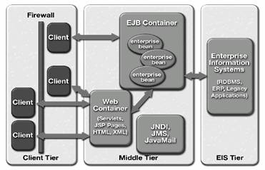 Platforma J2EE pune la dispozitie un model multi tier distribuit de realizare a aplicatiilor. Aceasta înseamna ca parti diferite ale aplicatiei pot sa ruleze pe calculatoare diferite. Arhitectura J2EE defineste un Client Tier , un Middle Tier (care poate fi compus din mai multe subtiers, de obicei denumite Web Tier si EJB Tier) si un Enterprise Information Tier care furnizeaza servicii utilizând sistemele de informatii deja existente (de obicei bazele de date).