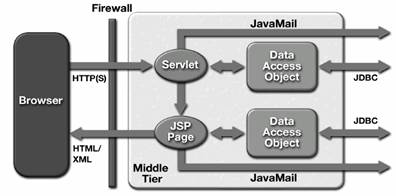 Middle tier furnizeaza servicii pe de o parte pentru clienti folosind containere Web si pe de alta parte pentru componentele de business folosind containere Enterprise JavaBeans.