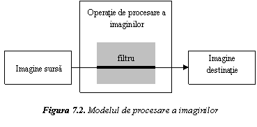 Pachetul java.awt.image contine câteva implementari ale clasei ColorModel, incluzând acele pentru reprezentari împachetate si pe componente ale pixelului. Tot acest pachet furnizeaza clase suplimentare care definesc operatii de filtrare asupra unor obiecte BufferedImage si Raster. Fiecare operatie de procesare este concretizata printr-o clasa care implementeaza interfata BufferedImageOp, sau interfata RasterOp, sau amândoua. Clasa de operatii defineste metodele de filtrare prin care se efectueaza manipularea imaginii. În Figura 7.2. este ilustrat modelul de baza pentru procesarile de imagini din Java 2D API.