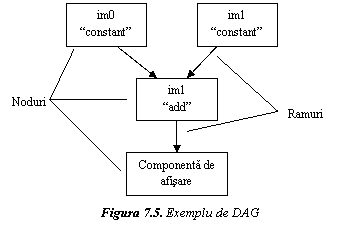 În forma cea mai simpla, un graf de procesare de imagini este un lant de obiecte operator cu una sau mai multe imagini sursa la un capat si o imagine destinatie la celalalt. Graful astfel creat este cunoscut sub denumirea de graf aciclic directionat (DAG - directed acyclic graph), unde fiecare obiect este un nod în graf, iar referintele la obiecte formeaza ramuri. (Figura 7.5.)