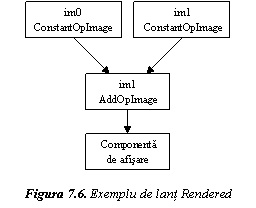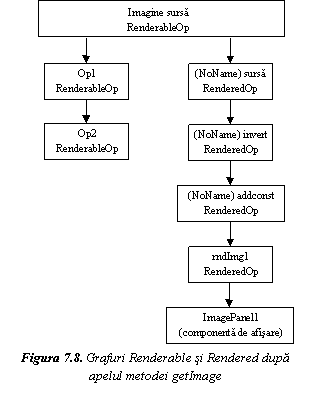 Imaginile sursa sunt obiecte care implementeaza interfata RenderedImage. Aceste surse sunt specificate ca parametri în constructia unor noi obiecte imagine. Fragmentul de cod urmator (Exemplul 7.10.) exemplifica construirea unui lant Rendered.