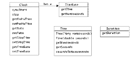 Clasele care suporta modelul de timp JMF implementeaza interfata Clock pentru a tine cont de 838f56i timpul necesar pentru o anumita operatie efectuata asupra unui stream media. Interfata Clock defineste operatiile de baza de cronometrare si sincronizare, care sunt necesare pentru a controla prezentarea media.