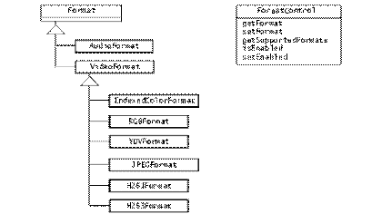 Un AudioFormat descrie atributele specifice unui format audio, ca rata (sample rate) sau numarul de canale. Un VideoFormat încapsuleaza informatii referitoare la datele video. Mai multe formate sunt derivate din VideoFormat pentru a descrie atributele formatelor video uzuale, incluzând: