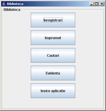Avem 5 butoane: Inregistrari, Imprumut, Cautari, Evidenta, si Iesire aplicatie.