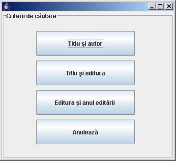 Pentru a cauta o carte dupa criterii: apasam butonul Cautari. Avem 4 butoane: titlu si autor; titlu si editura; editura si anul aparitiei; anuleaza. Pentru a iesi apasam "Anuleaza".