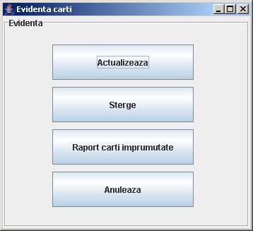 Apasand butonul Evidenta apar butoanele: Actualizeaza - pentru a modifica titlul, autorul, editura si anul aditarii si apasam "Actualizeaza". Pentru a iesi apasam "Iesire". Stergere - pentru a sterge o carte; butonul "Raport carti imprumutate" - apare lista cartilor imprumutate. Pentru a salva lista apasam butonul "Salveaza". Pentru a anula apasam "Anuleaza".
