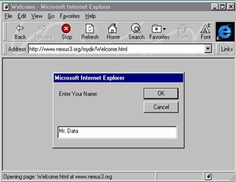 In listingul 31.2 este prezentata folosirea variabilelor intr-un script pentru a realiza o pagina Web care adreseaza utilizatorului o urare de bun venit personalizata. Scriptul incorporat in documentul HTML va apela metoda window.prompt() solicitand utilizatorului sa-si tasteze numele iar dupa aceia va folosi functia document.write() pentru a afisa mesajul de bun venit personalizat cu informatia introdusa de acesta. Fereastra de dialog pentru introducerea numelui utilizatorului si pagina de Web afisata de browser dupa obtinerea raspunsului la prompt sunt redate in figurile 31.2a si 31.2b.
