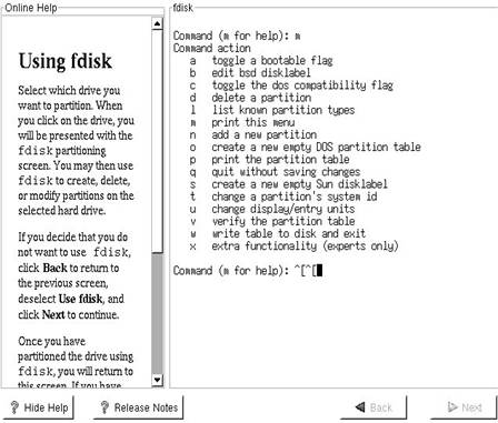 Aceasta comanda va comunica programului ca doriti sa lucrati cu partitiile primului disc IDE. Asa cum o arata si FIG 2.5 fdisk afiseaza un prompt "Command (m for help):" unde puteti introduce litera m pentru a obtine un ecran help (de ajutor) (FIG 2.5).