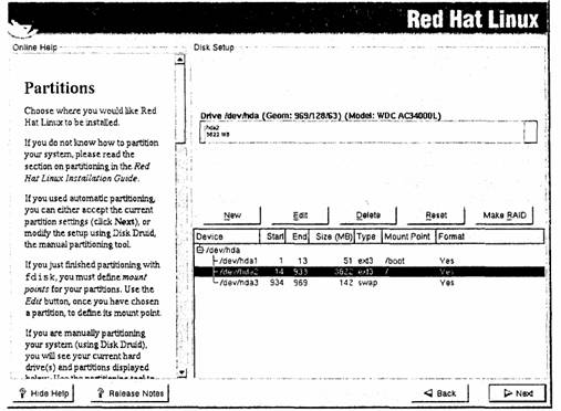 Daca optiunea Review este activata, instalarea va continua cu programul Disk Druid, permitând modificarea partitiilor create automat.