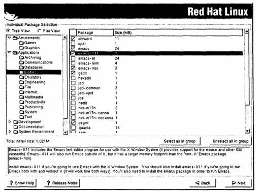 Lista de pachete poate fi afisata fie grupata dupa tipul acestora, fie în ordine alfabetica, în partea de jos a ecranului este prezentata descrierea pachetului pe care se afla cursorul.