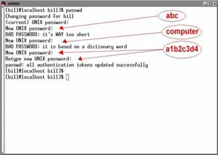 Cand utilizatorul X decide sa-si modifice parola el doar scrie comanda "passwd&q 18218q165s uot;, apoi i se cere sa scrie vechea parola o data (pentru a fi sigur ca persoana care modifica parola este utilizatorul insasi si nu o alta persoana care profita de conexiunea uitata deschisa a cuiva .......) si apoi cere de doua ori parola noua)(FIG 5.2).