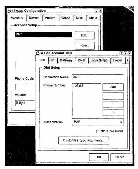 Acest program poate fi executat fie din meniul Internet:: Dialup Configuration (pe sistemele Red Hat), fie din Nefworking :: Remote access :: Internet Dialer (pe Mandrake), fie din linia de comanda cu kppp s.